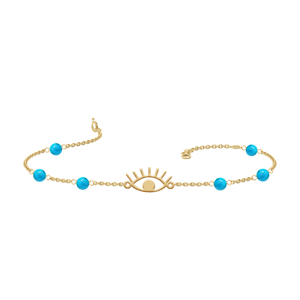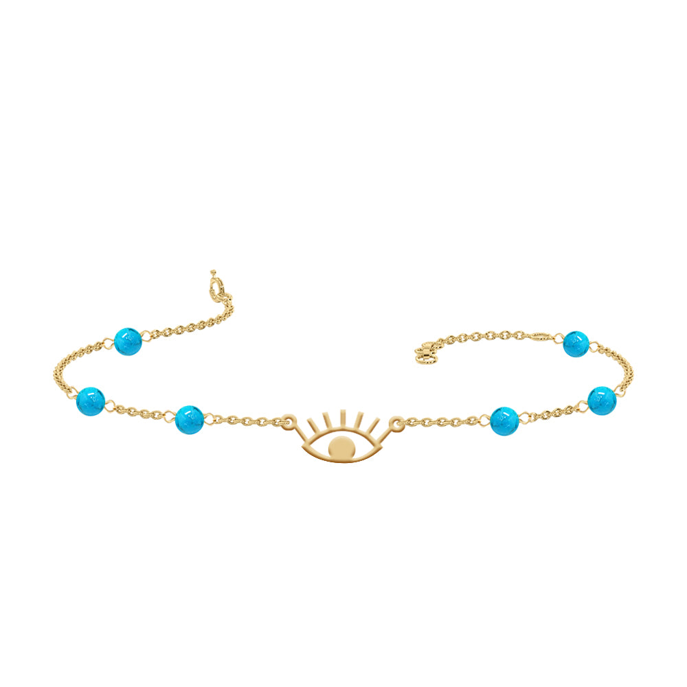 This beautiful 18Kt gold anklet has 5 shiny and glossy eye stones. This fringed anklet will be a great addition to your collection, whether you wear it alone or with other jewelry.
