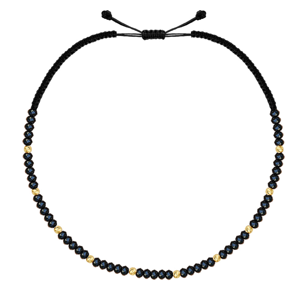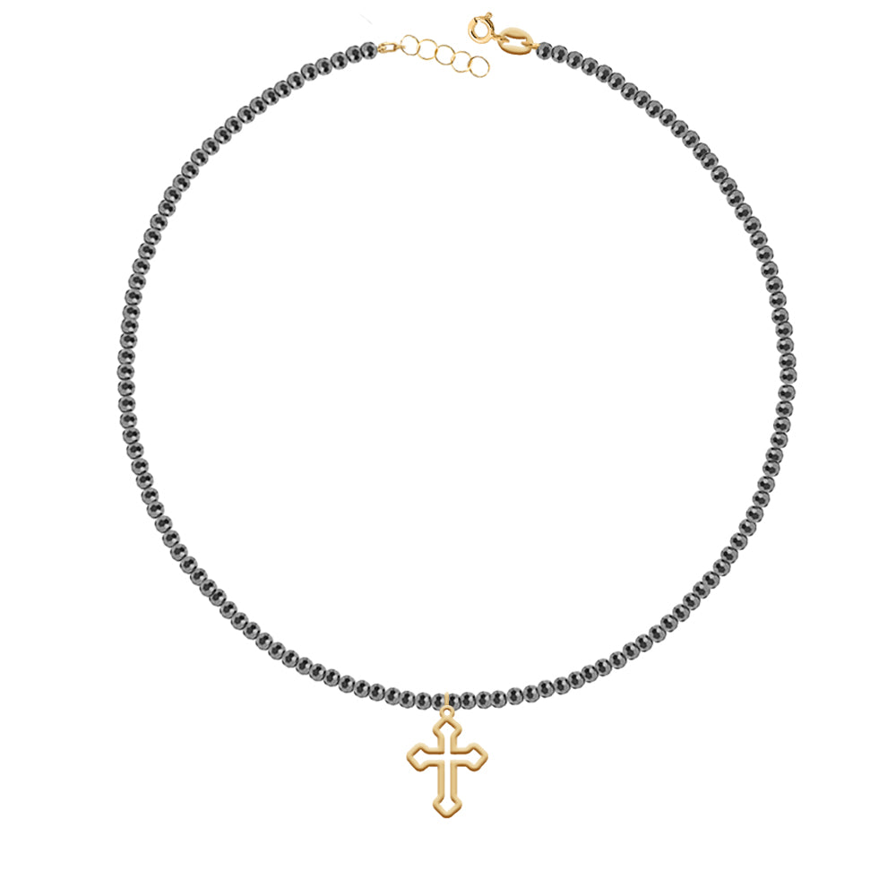 The 18kt gold lock, gold Cross, and dark grey hematite stones work together to achieve an elegant look that will have you sparkling and will never go out of style.