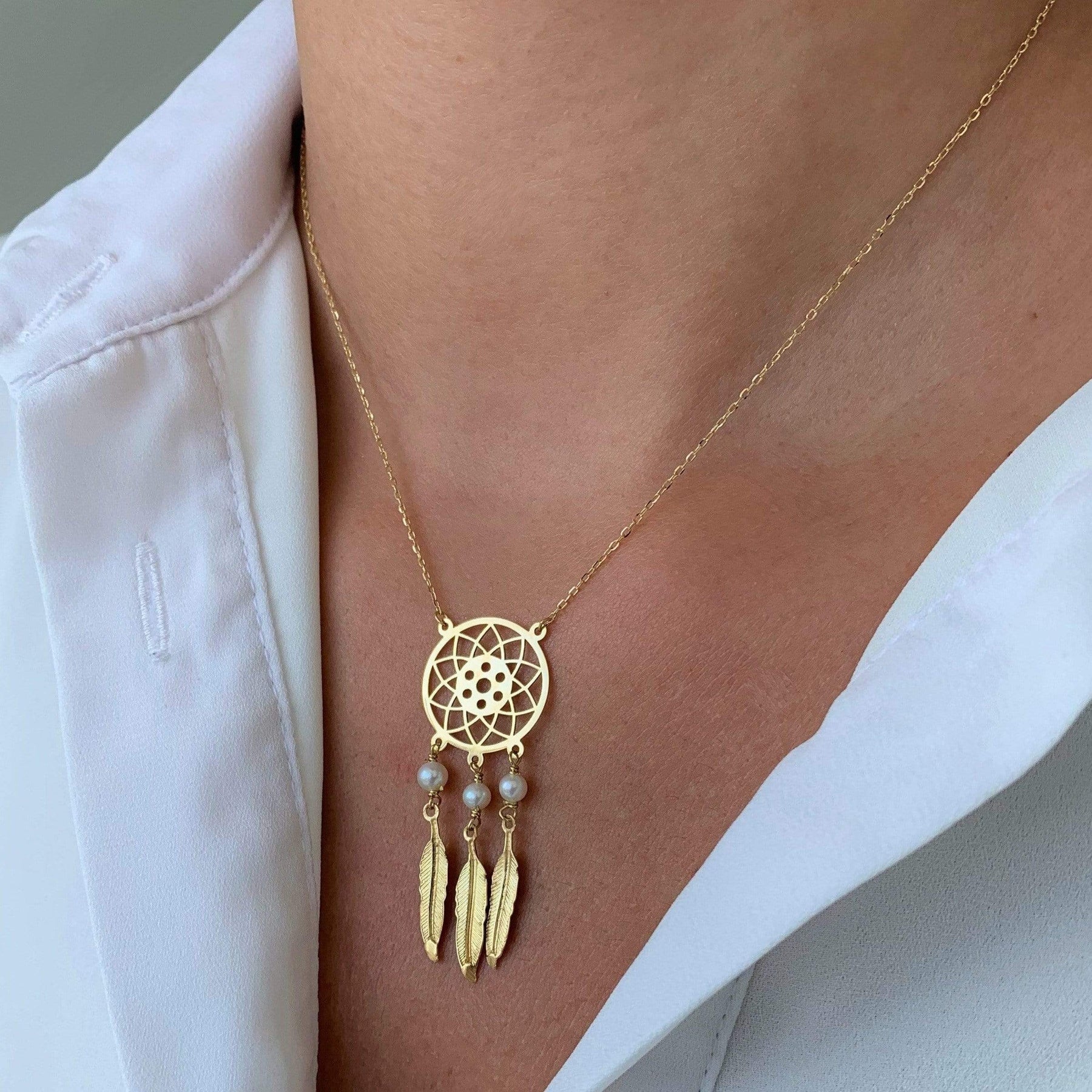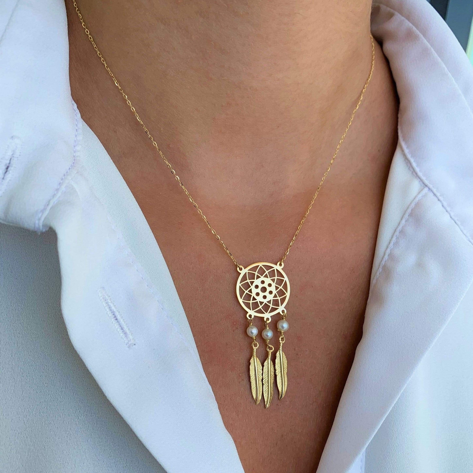 Chic appeal with this 18Kt Gold Dream Catcher Feather necklace